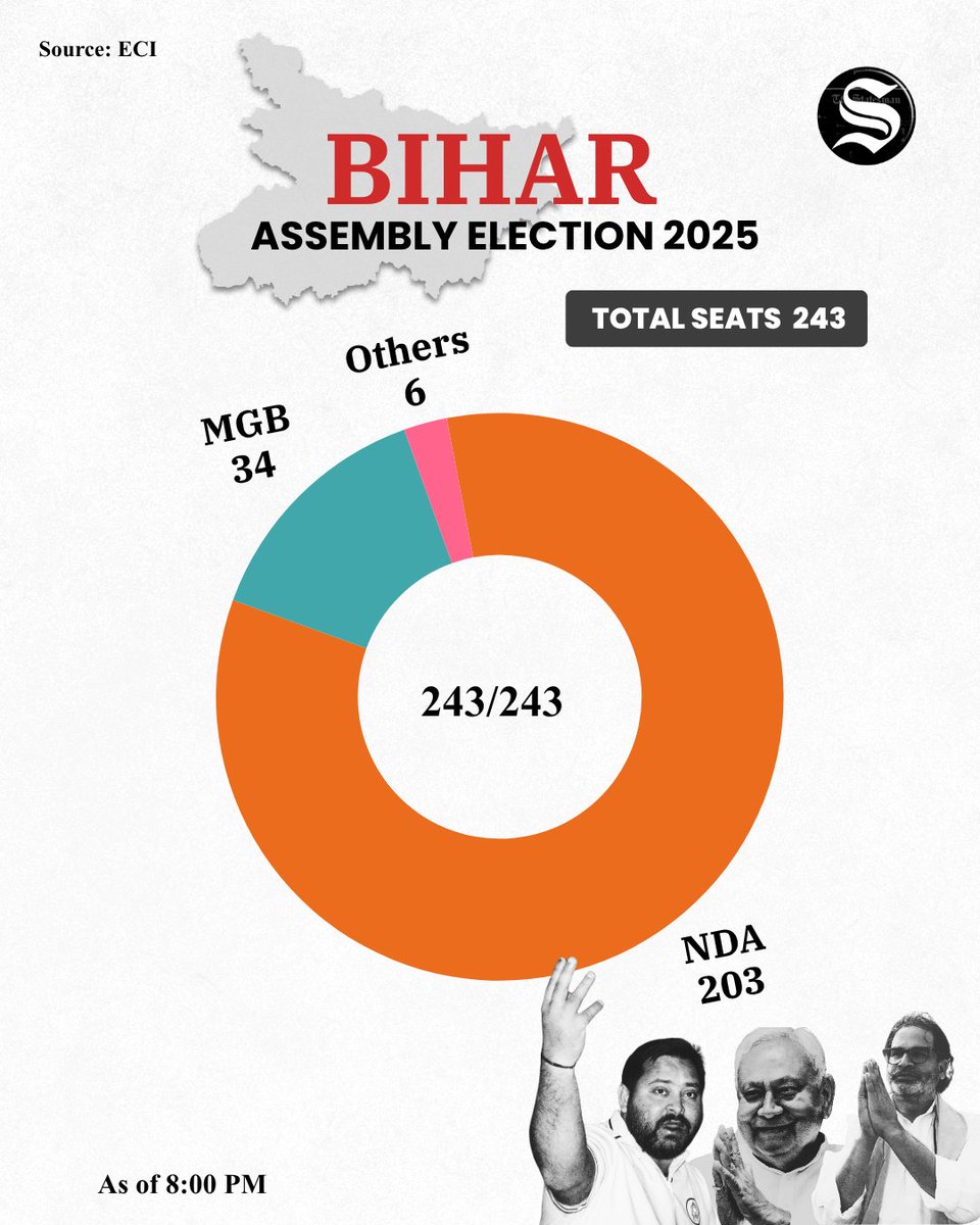 - 인도 북부 주(州)인 비하르에서 실시된 2025년 주의회 선거에서 여당 연합인 BJP-JDU가 243석 중 약 183석을 획득하며 압승을 거뒀습니다. India Today+1