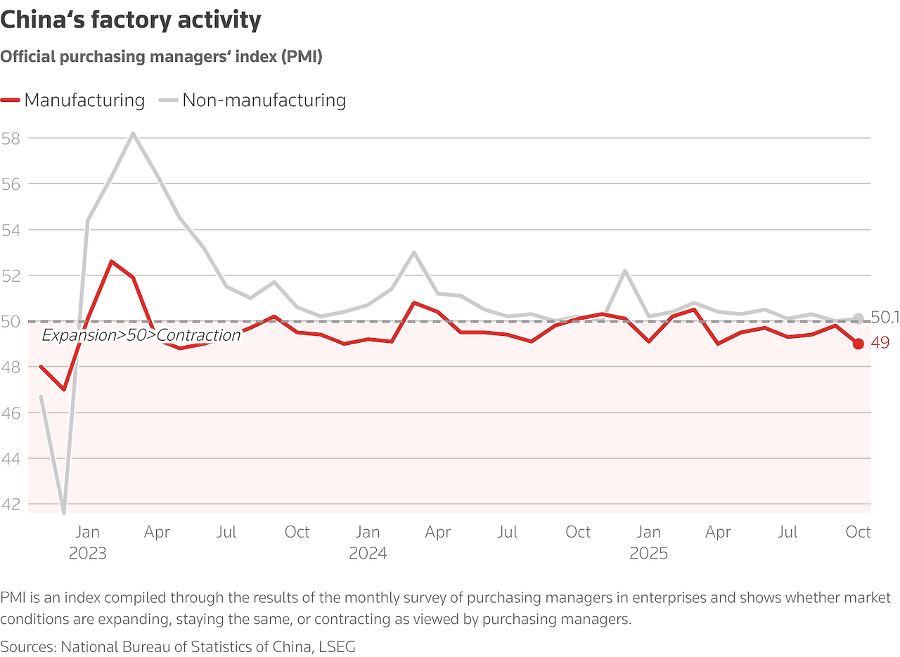 - 중국의 2025년 10월 산업생산이 전년 대비 4.9% 증가했으며, 이는 작년 8월 이후 가장 낮은 수치입니다. Reuters+1