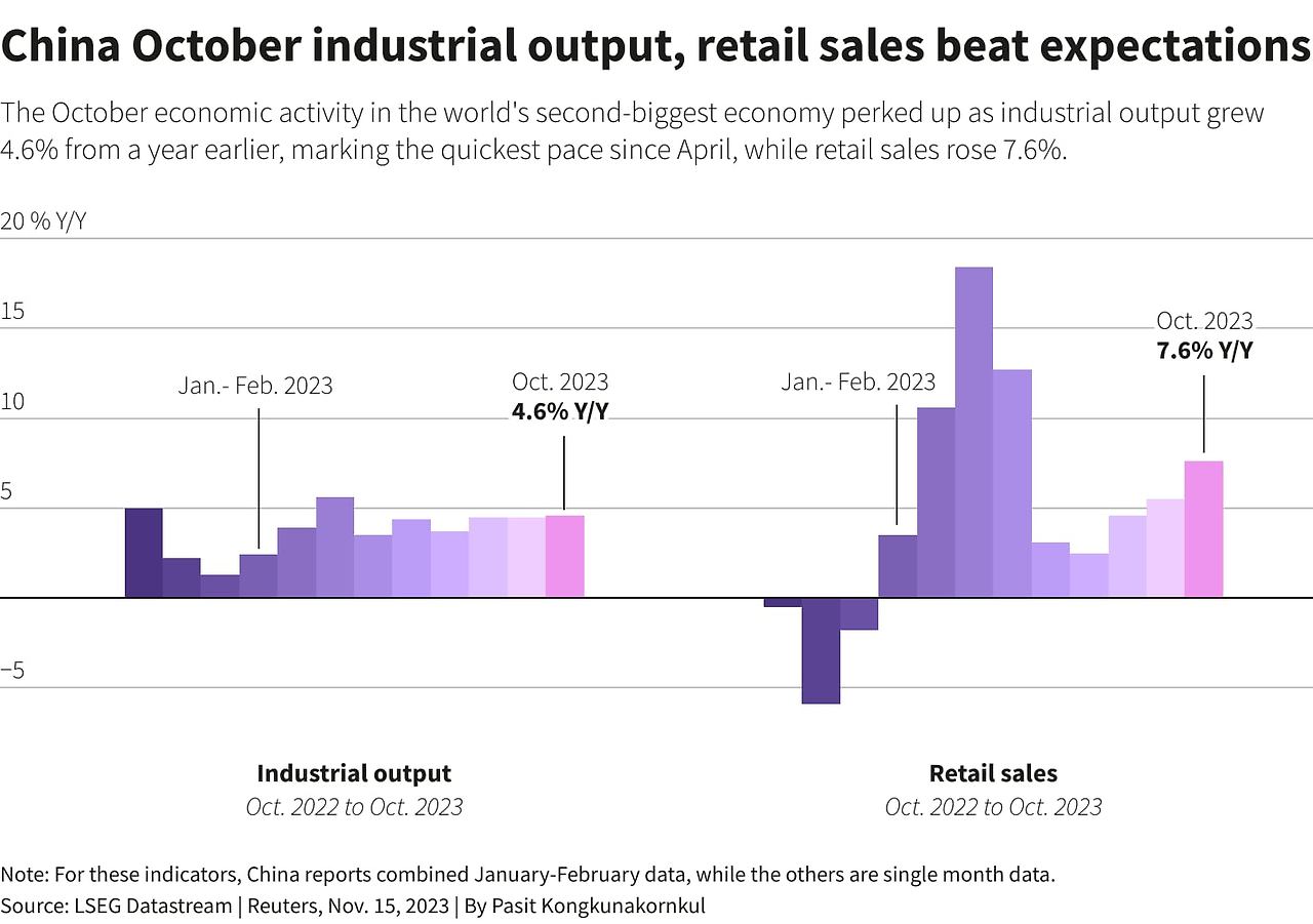 - 중국의 10월 공장생산이 전년 대비 4.9% 증가하는 데 그쳤고, 소매판매는 2.9% 증가로 1년 이상 만에 최저 수준을 기록했습니다.