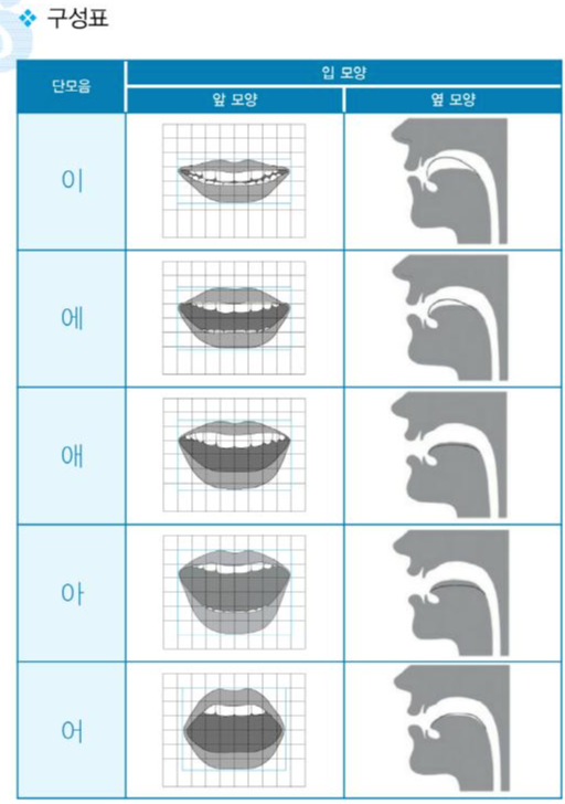 - 모음의 형태, 입 모양, 혀의 위치를 그림으로 제시