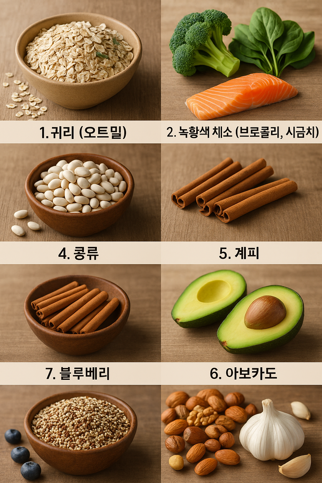 | 1 | 귀리 (오트밀) | 수용성 식이섬유인 β-글루칸이 풍부해 당 흡수를 느리게 하여 혈당 급상승을 방지합니다. GI(혈당지수)가 낮아 아침식사로 특히 좋습니다. |
